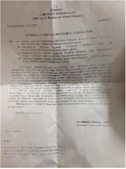 İddiaya göre 2004 yılında KANALTÜRK'e test yayını aşamasında para aktaran Koç Grubuna ait BEKO Ticaret A.Ş'nin Ergenekon'a finans sağlama soruşturmasıyla dahil edildi. Bu soruşturma dosyasının altında olay savcı Muammer Akkaş'ın imzası var.